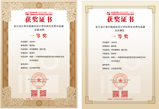 近日,2025米兰设计周中国高校设计学科师生优秀作品展教师组全国决赛获奖名单公布,我校国际文化与传播学部传播学教研室梁译丹老师的作品荣获教师组非命题赛场(时尚设计赛场)国赛一等奖、北京赛区一等奖。梁译丹老师的参赛作品从中国传统文化的“和谐”思想出发,通过当代设计语言激活传统文化生命力,强调传统文化的传承创新。