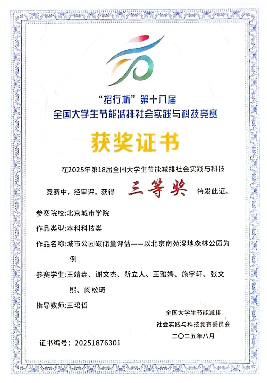 该团队学生来自城市建设学部风景园林专业、地理信息科学专业以及信息学部人工智能专业、数据科学与大数据技术专业。他们积极关注北京城市建设热点问题,通过科学测算、量化评估,围绕南苑湿地森林公园这一北京南部地区重要的生态空间进行了碳储量分析,为低碳城市规划与生态建设提供了数据支撑,具有现实意义。该成果展现了我校风景园林生态研究的探索,也充分体现出我校跨学部、跨专业学生培养的积极效能。