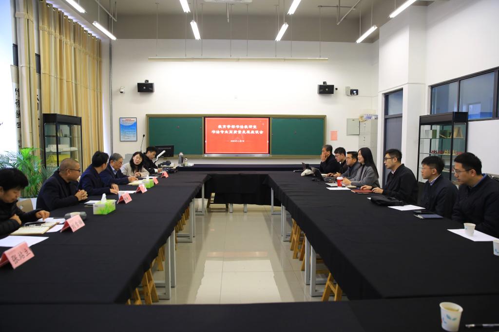 11月5日,教育学部书法专业高质量发展座谈会在教学楼文房四宝室顺利召开。党委常委、教师工作部部长蔡派,教育学部主任周建辉,文化遗产学部主任陈秋荣,教育学部特聘教授陈池瑜,学校教育教学质量保障处老师以及书法教研室全体教师参会。会议由周建辉主持。
