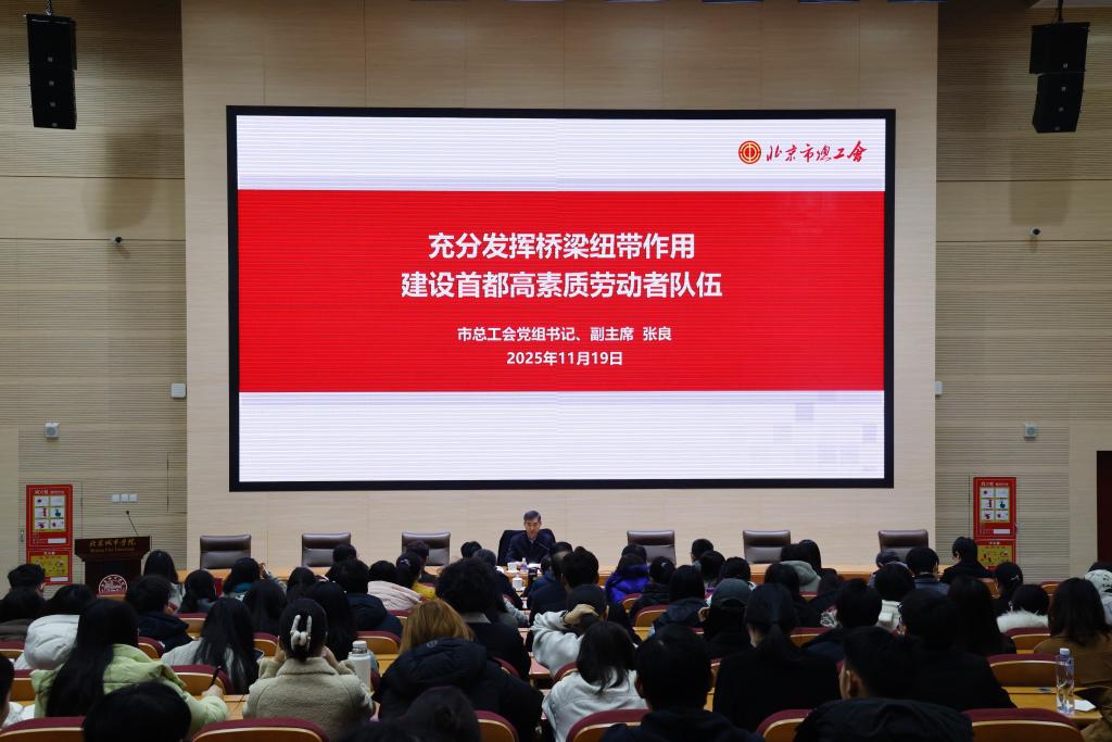 11月19日,北京市领导干部上讲台讲思政课市级师资库成员,市总工会党组书记、副主席张良来到我校,以“充分发挥桥梁纽带作用,建设首都高素质劳动者队伍”为主题讲授思政课,并就我校“首都工匠学院”建设情况召开座谈会。校党委书记龚裕,党委常委、统战部长蔡派,党委常委、组织部长汪娟,副校长郭红霞、张会莹,以及200余名师生参加学习。龚裕主持。