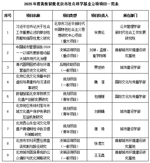 我校9个项目获批2025年度北京市社会科学基金项目立项