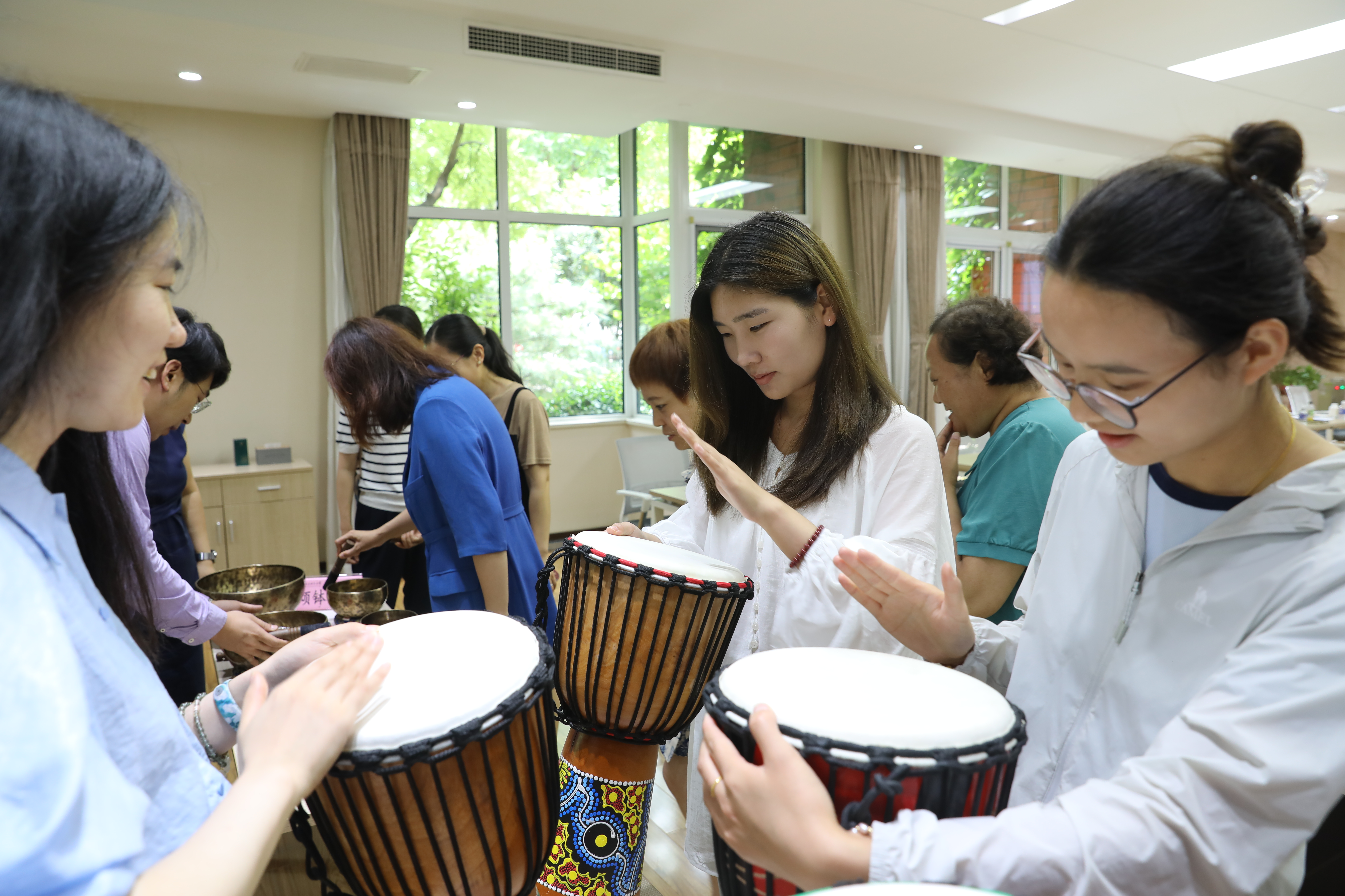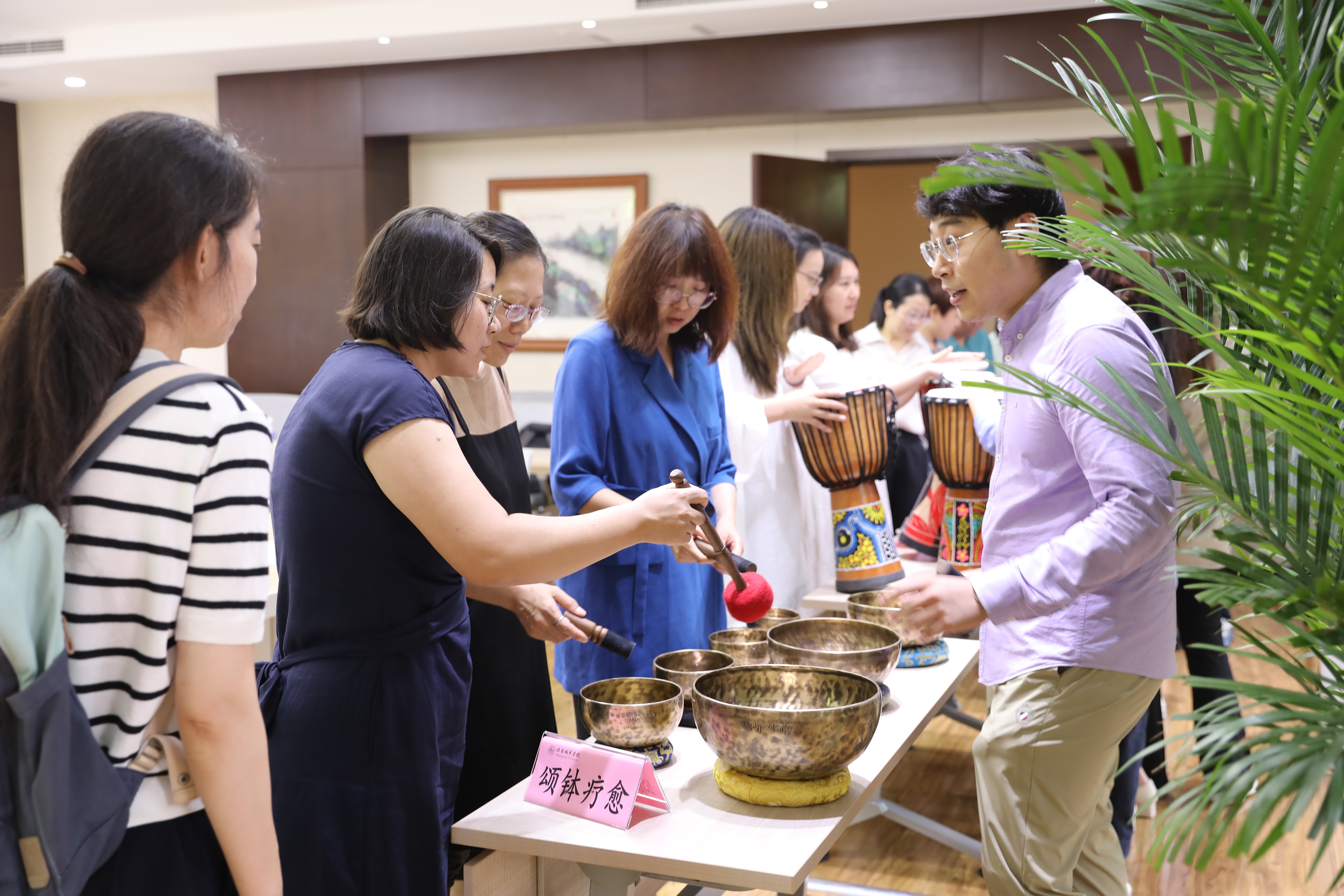 会后,我校心理咨询师团队带领与会人员体验颂钵、非洲鼓、OH卡及绘画等艺术疗愈活动。