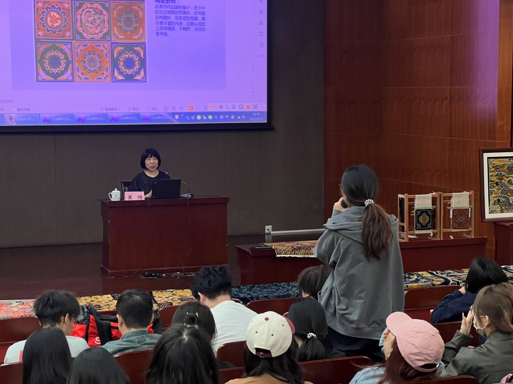 讲座尾声,冀豫大师寄语青年学子:宫毯是“指尖上的非遗”,每一根丝线都承载着中华美学的基因,希望更多年轻人能关注传统工艺,让千年技艺在新时代焕发新生。现场互动环节,师生们踊跃提问,就非遗传承、技艺创新等话题与大师展开深入交流。