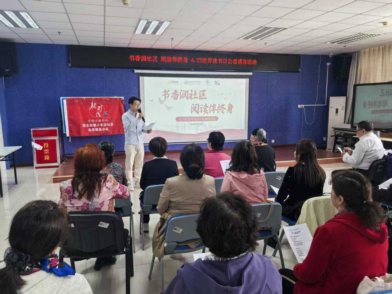 4月23日,我校老年大学与海淀区西北旺镇市民活动中心携手举办“书香润社区 阅读伴终身”公益诵读活动。来自西北旺镇小辛店社区的四十余位老年人欢聚一堂,以声传情、诵读经典,共赴一场温馨馥郁的书香之约。