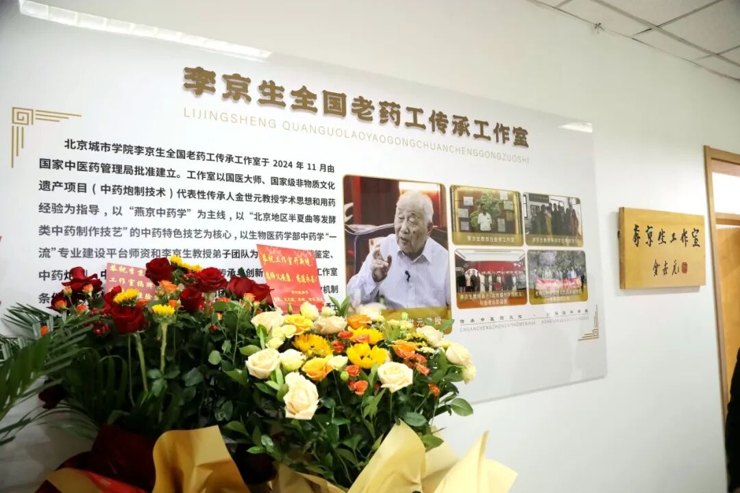 在揭牌仪式环节,李德娟与田培源共同为“李京生全国老药工传承工作室”揭牌。随后,举行了师承班授旗仪式,由李京生教授向学员代表授旗,象征着中医药技艺的代代相传。与会嘉宾向李京生教授献花,多家企业和医疗单位送来鲜花,共同表达对老一辈中医药人的崇高敬意。
